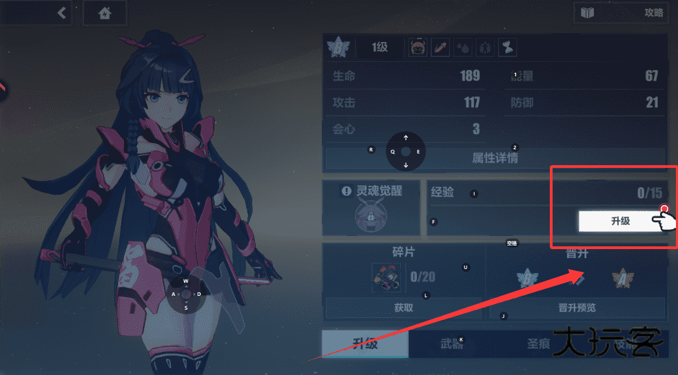 1、然后呢,在面板附近找到“升级”这个选项,点击进去,就能开始我们的强化之旅啦。