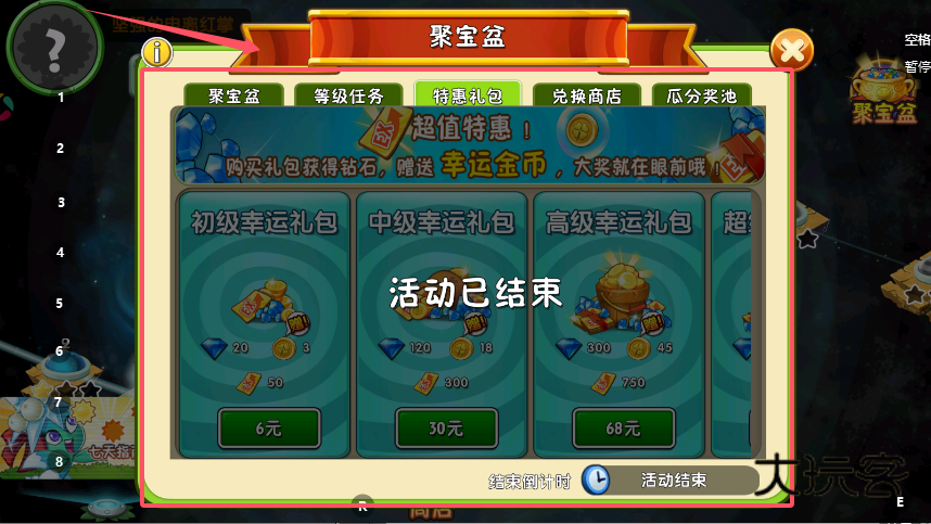 4、在特惠礼包处选购不同价位的礼包,获取钻石与幸运金币,再到兑换商店用幸运金币兑换植物进阶书、金币、培养液等道具,兑换时需留意各道具的消耗数量与限购次数。