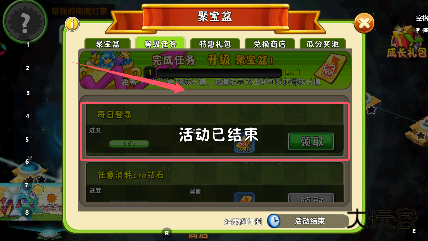 3、打开等级任务页面,完成每日登录、消耗钻石等任务来积累成长值,成长值达标后聚宝盆自动升级,升级后可解锁更多福利,任务进度会清晰展示完成状态与剩余目标。