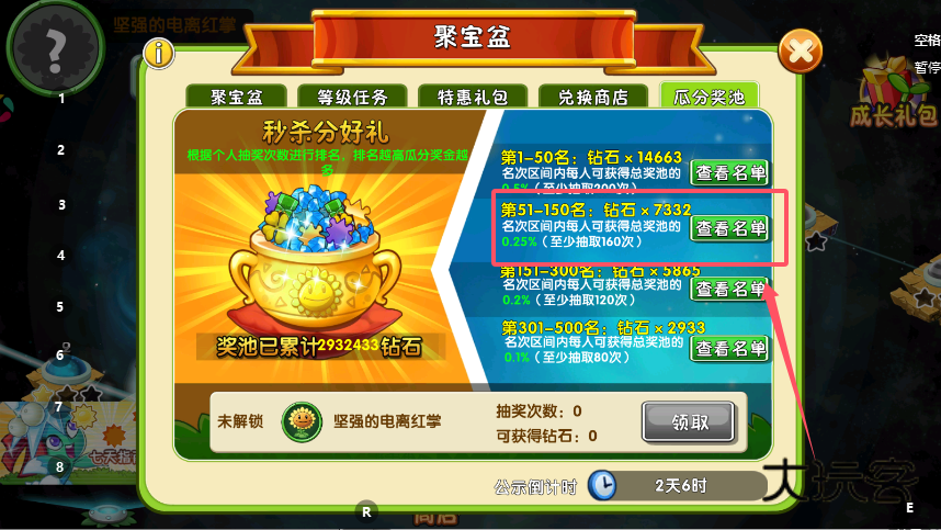 1、进入瓜分奖池界面,查看各名次区间的奖励规则,比如151-300名可获得奖池0.2%的钻石,需至少抽奖120次,通过增加抽奖次数提升排名,以此获取对应比例的奖池钻石。
