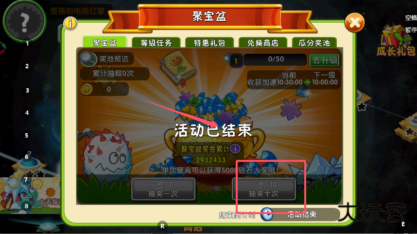 2、在聚宝盆主页面,选择单次或十次抽奖操作,每次抽奖都会累计次数,这些次数是提升瓜分奖池排名的依据,同时聚宝盆等级可通过成长值升级,等级越高奖励收获速度越快。