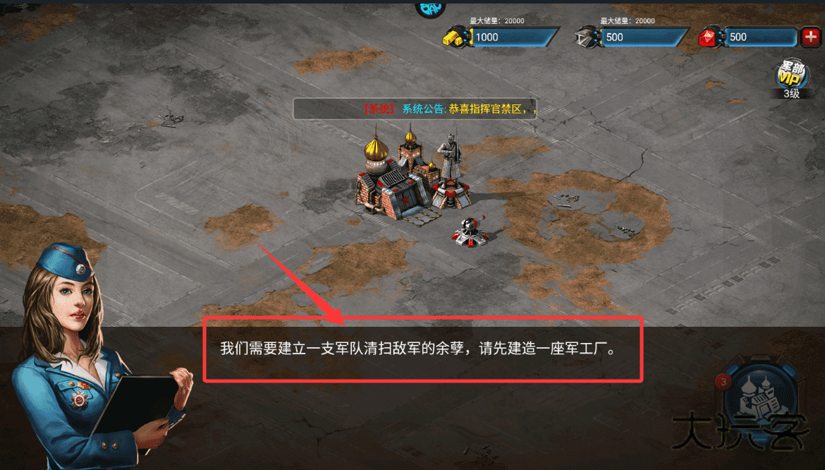 3、根据游戏引导,首要任务是建造基础生产建筑与军工厂。军工厂是训练作战单位的前提,只有建立军队才能完成清扫敌军、参与竞技场对抗等核心玩法内容。