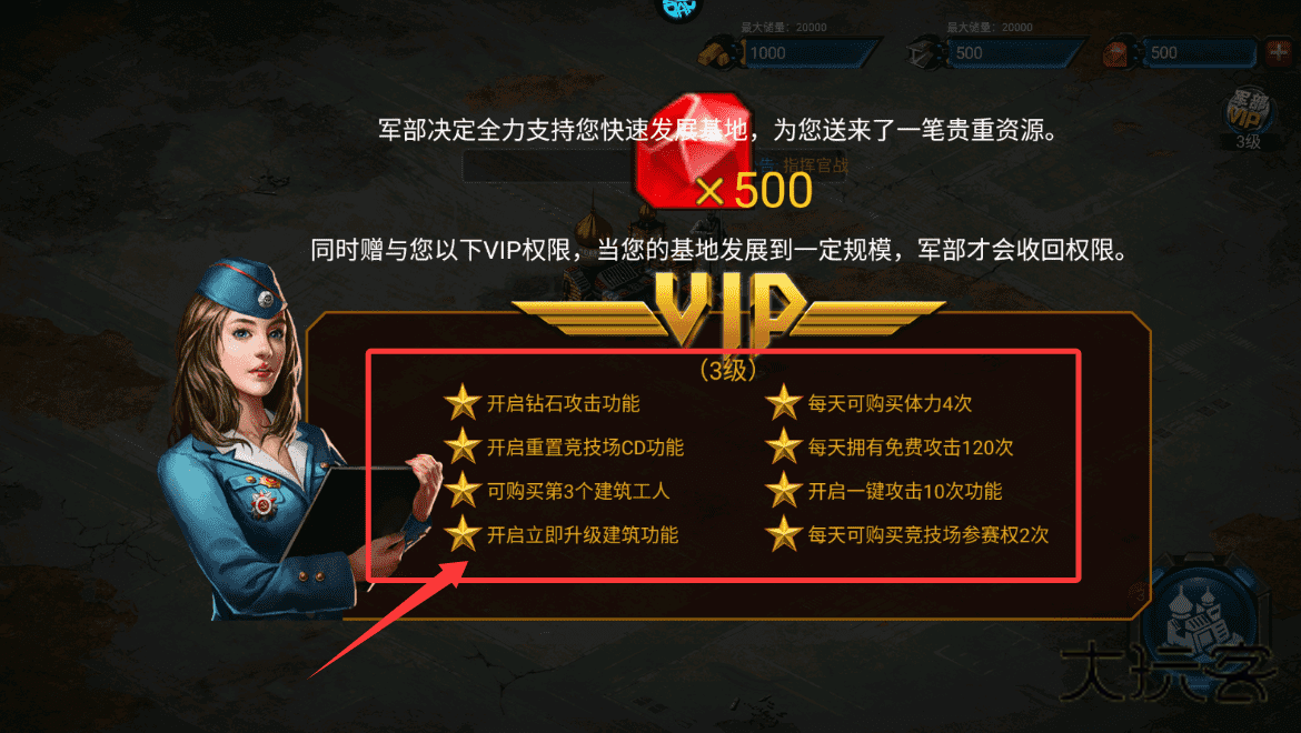 最低要求:VIP3(100元),每天可购买体力4次,每天拥有免费扫荡120次,开启一键扫荡10次功能,开启立即升级建筑物功能,开启战斗加速3倍功能,当然,还享有其他特权,但是这几个特权非常有助于你快速建造和升级,钻石不要乱花,可专注购买体力哦!