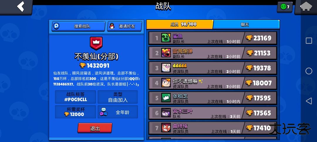 主界面右侧有个战队,其实你加不加,加哪个都无所谓,反正也不是像皇室或部落那样可以给东西需要打对战的,纯粹就是与一些和你一样的玩家一起交流,当然你加到一个战队之后打游戏就可以找战队里的人组队,又get到了一个冲杯技巧对不对(ಡωಡ) 。我的战队: