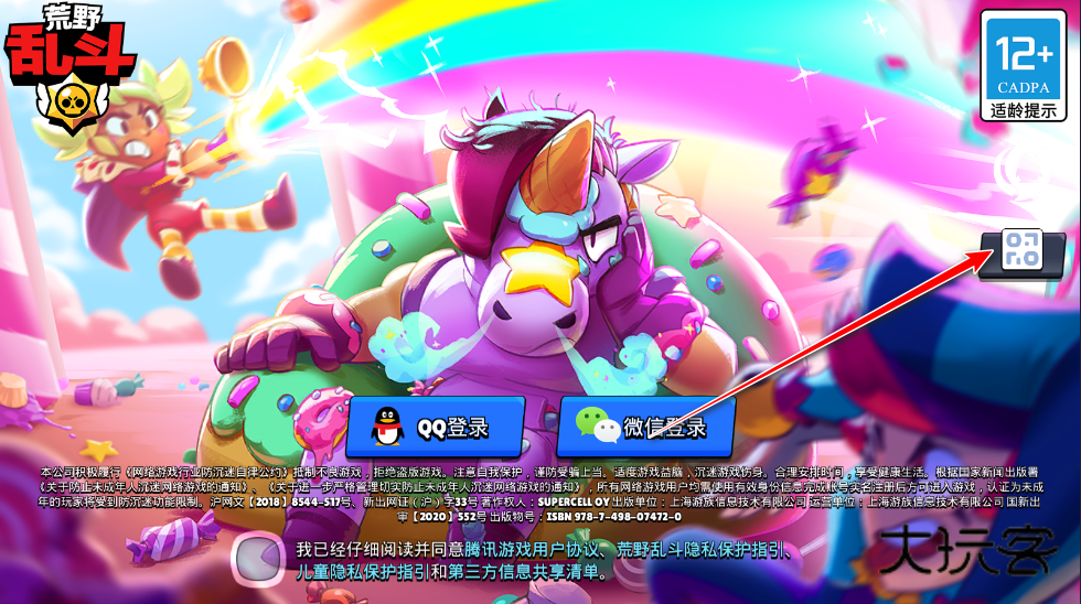 1.打开荒野乱斗,在登录界面其实是有个小二维码图标的,如下图所示的位置,我们点击这个二维码图标