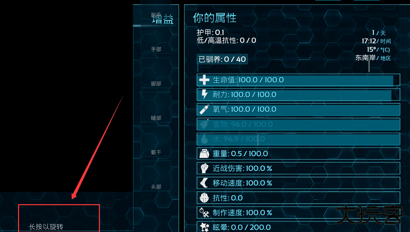 3、屏幕右侧通常有操作按钮,比如长按可以旋转视角查看周围环境,初期要多收集资源。