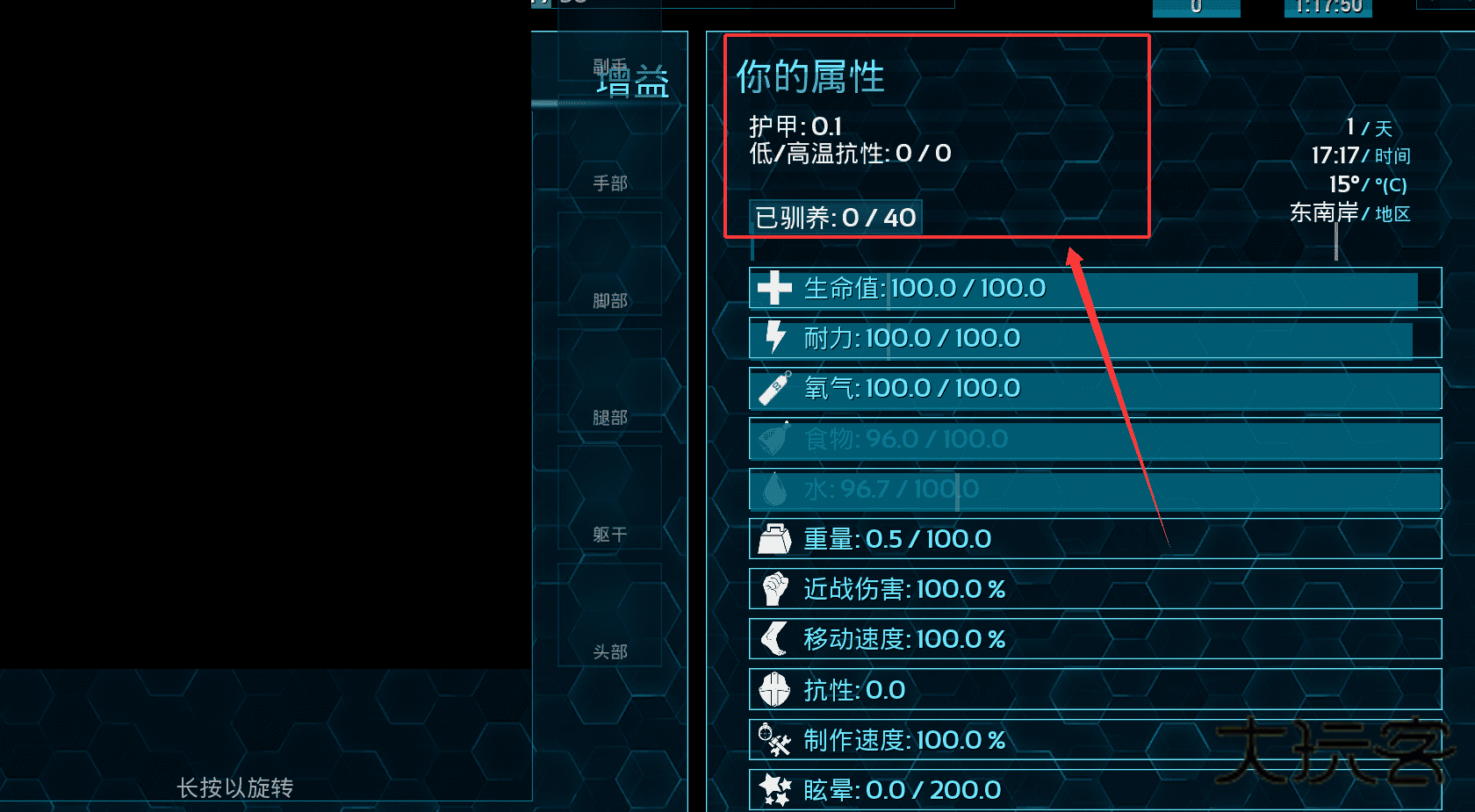 2、进入游戏后要注意屏幕左上角的属性面板,那里会显示你的生命值、耐力、食物和水等重要状态。