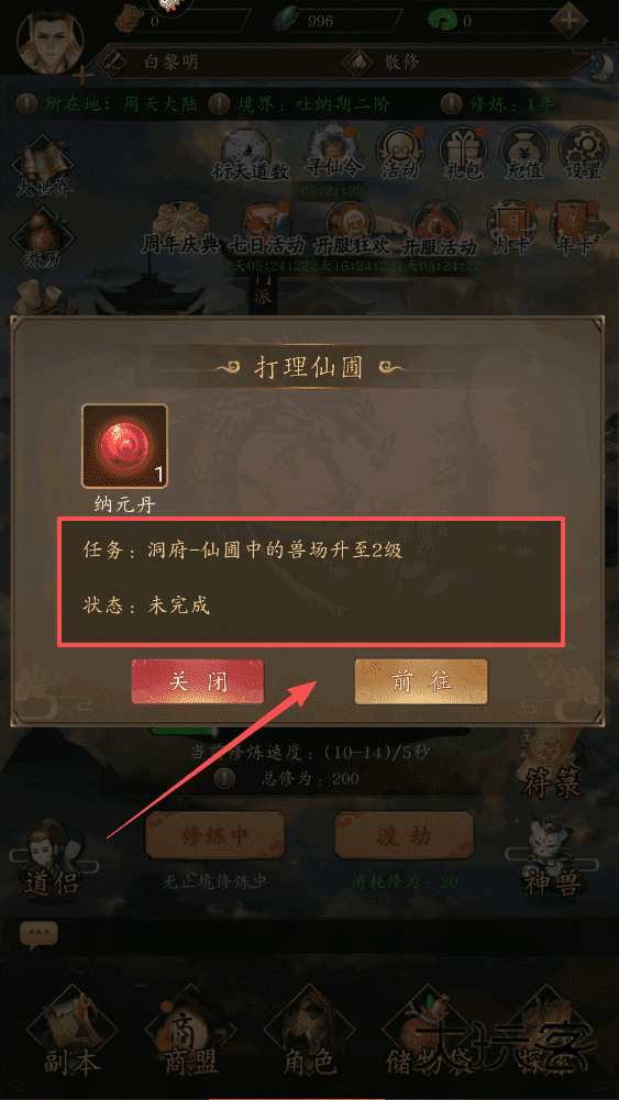 2、在主界面留意顶部任务提示,比如打理仙圃任务,可点击前往按钮直接跳转。