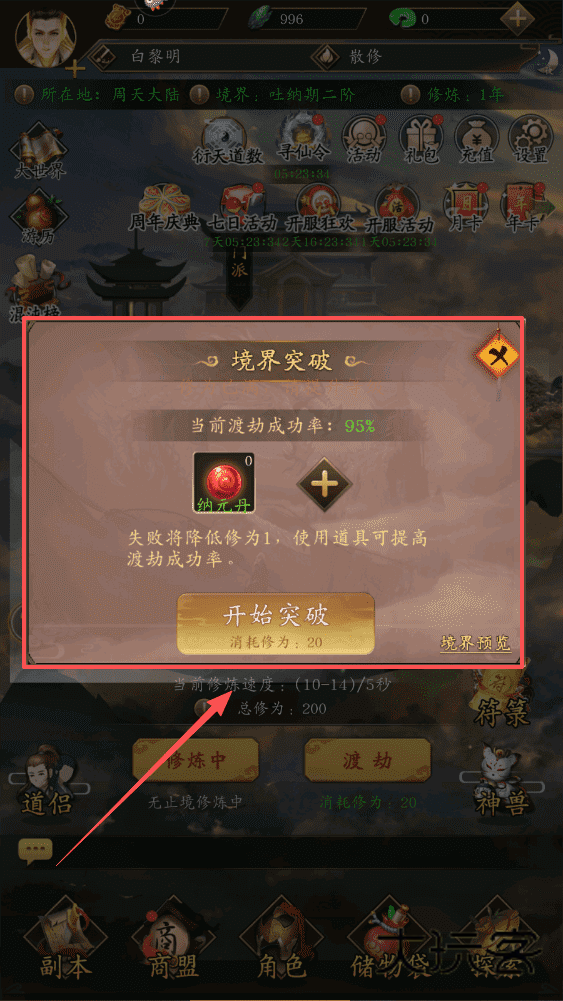 3、境界突破时,记得查看成功率并使用纳元丹提升,准备好修为再点击开始突破。