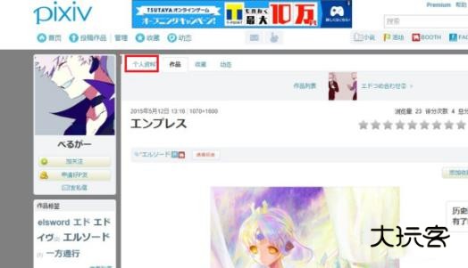 2、此时你看到的是选择的画师的个人全部作品页,点击旁边的【个人资料】。