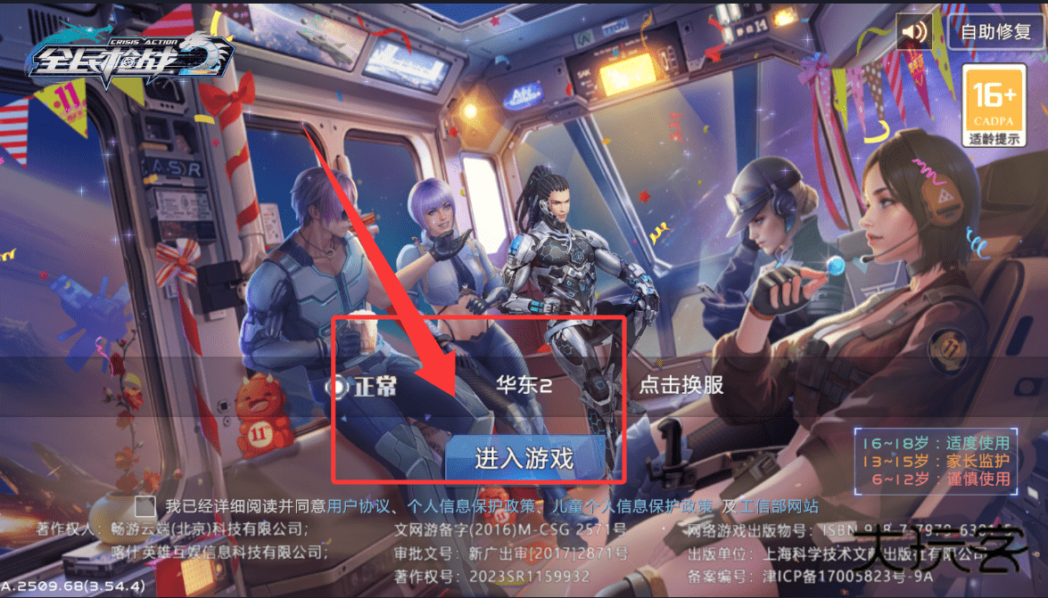1、启动应用后首先完成区域服务器的选择,建议优先进入“华东2区”以获得稳定连接,随后仔细阅读适龄提示与著作权声明,确认协议后即可点击主界面的开始按钮载入游戏。