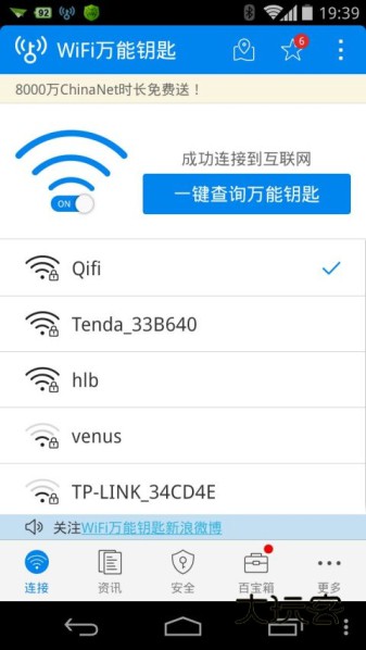 3、wifi万能钥匙是一款基于分享经济模式而推出的免费上网工具。这款app用户无论身处何地,只要打开wifi万能钥匙,即可看到周围有哪些可分享热点,点击连接即可上网。它为不少用户朋友省下很多的流量,连接非常方便,只要是合理的范围内,就没有连接不上的WiFi