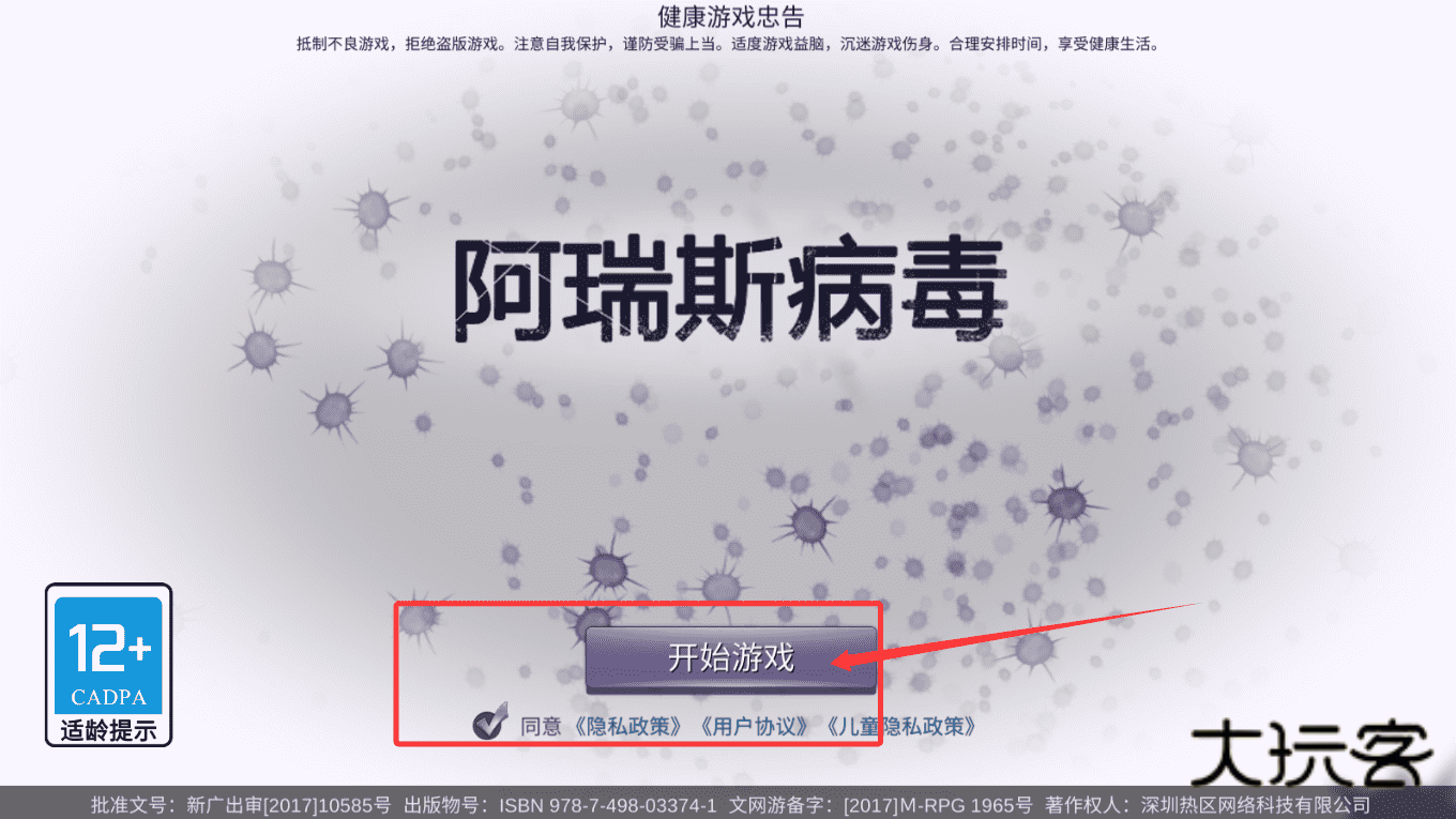 1、进入《阿瑞斯病毒》游戏,初始界面会展示健康游戏公告与适龄提示内容,点击中央的“开始游戏”按钮进入主菜单界面,在此处能够选择创建新游戏或载入已有存档。