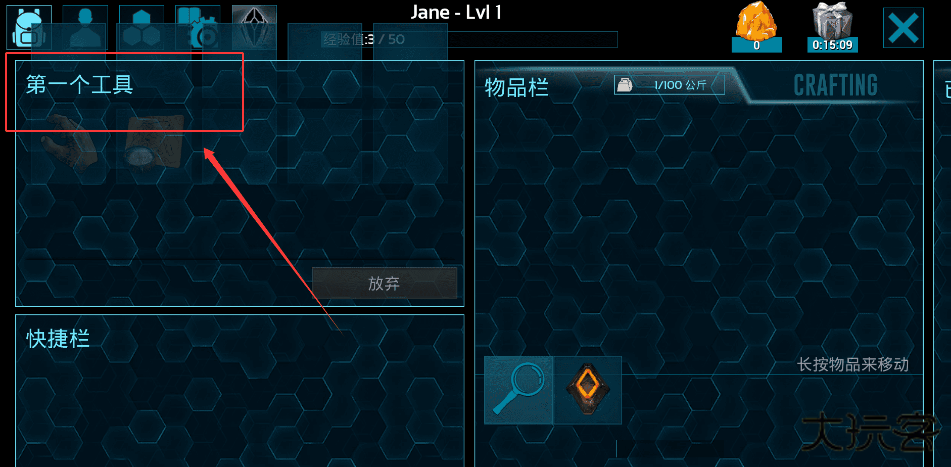 1、打开游戏后,你首先会看到角色状态栏,比如 Jane - Lvl 1,代表角色名称和等级。