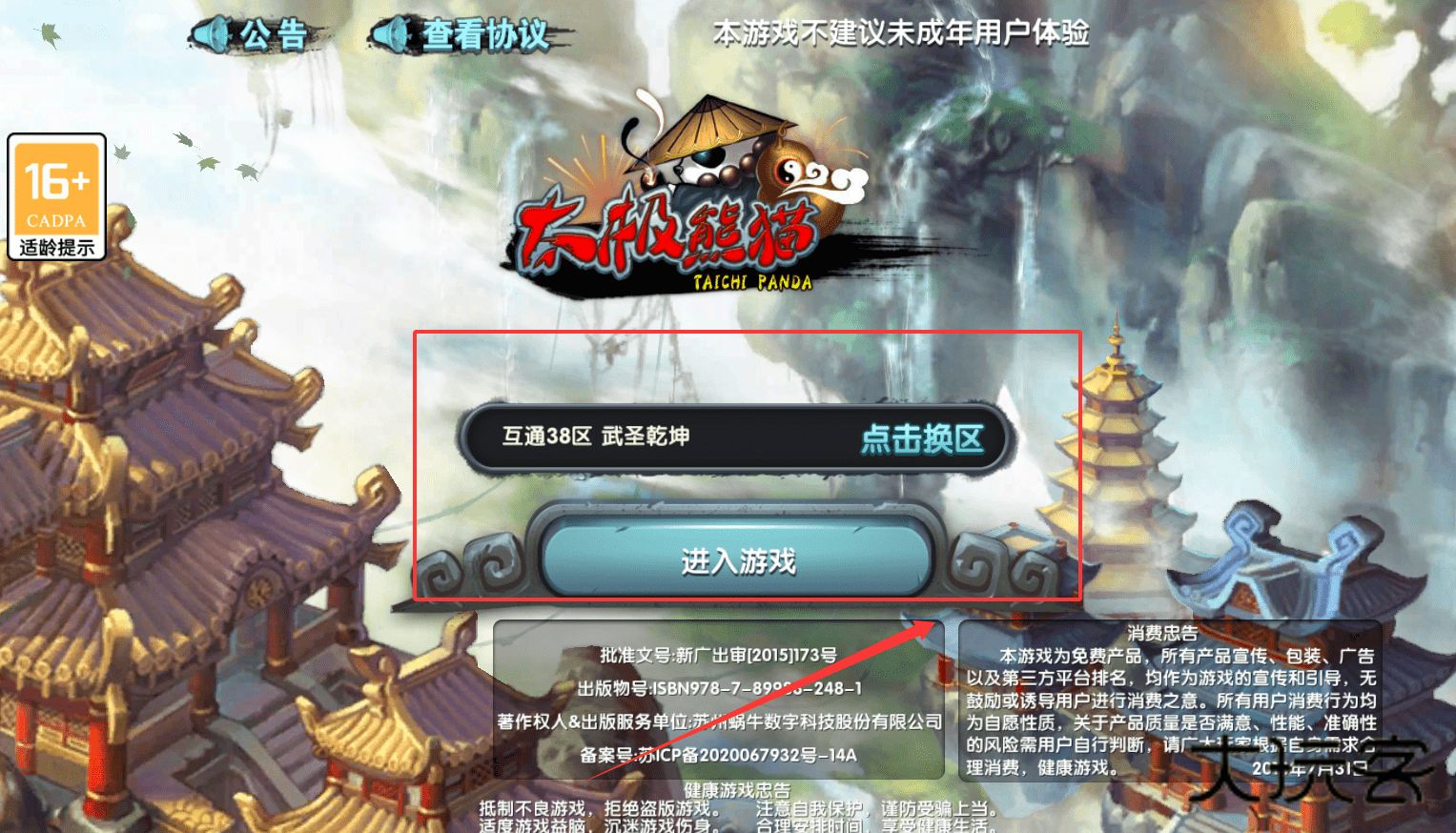 1、首先,在登录界面看到公告和适龄提示后,仔细阅读协议,然后点击“进入游戏”即可开始。记得根据自身情况合理消费哦。