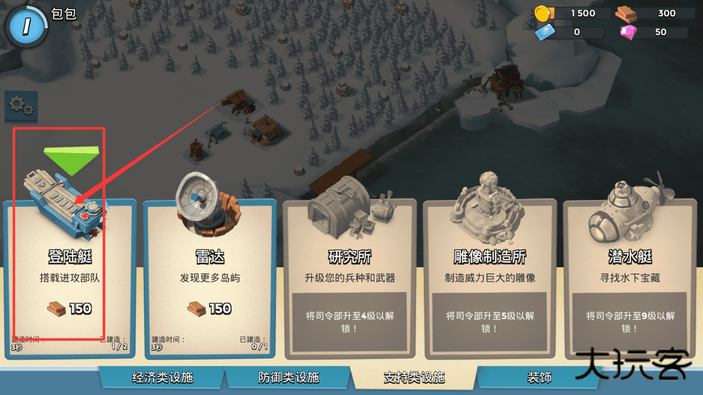 2、在可建造的建筑列表中,“登陆艇”是初期关键的军事设施。它用于搭载和运输你的进攻部队,升级登陆艇可以增加其运载容量,从而在一次进攻中投入更多兵力。