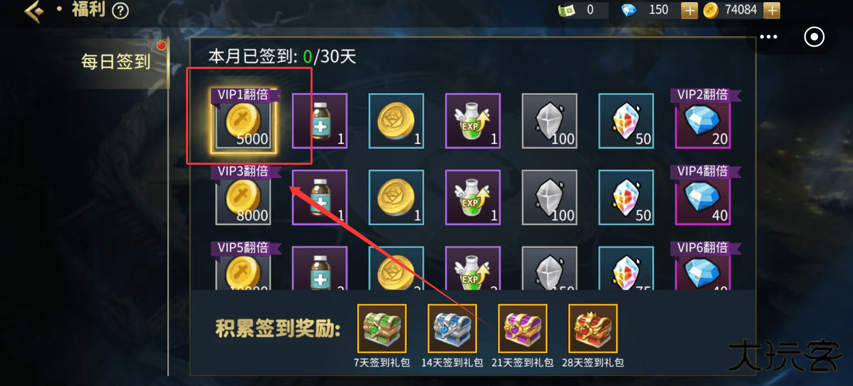3、福利在专门界面中,记得每日签到,VIP能领翻倍金币,坚持签到还有额外宝箱哦。