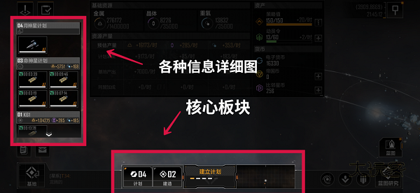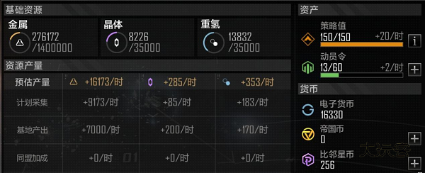 上图就是主界面的资源板块,便于我们直接了解个人的资源使用和产出情况,仓库的上限也可以直接观察到。金属、晶体、重氢属于三大基本资源,日常使用开销极大,经常观察个人资源使用情况,可以帮助玩家进行资源使用规划。