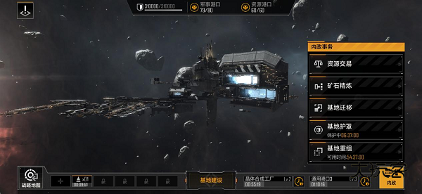 内政主要包括资源交易、矿石精炼、基地迁移、基地护罩、基地重组功能,不过大部分功能需要玩家提升自己的建筑等级才能解锁。前期新手玩家可以享受的是基地护罩保护自己度过新手期,以及不满意自己基地位置可以进行重组。