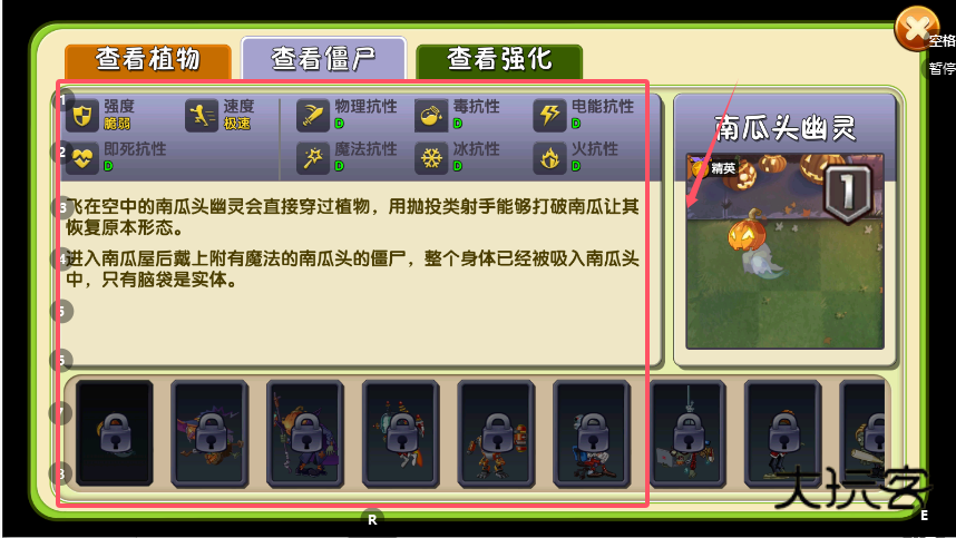 3、界面右侧则以大图形式展示当前所选僵尸的完整外观形象,图中会明确标注僵尸名称、类型与当前生命值。部分特殊僵尸如“南瓜头幽灵”还会配有“幽灵”、“精英”等分类标识。