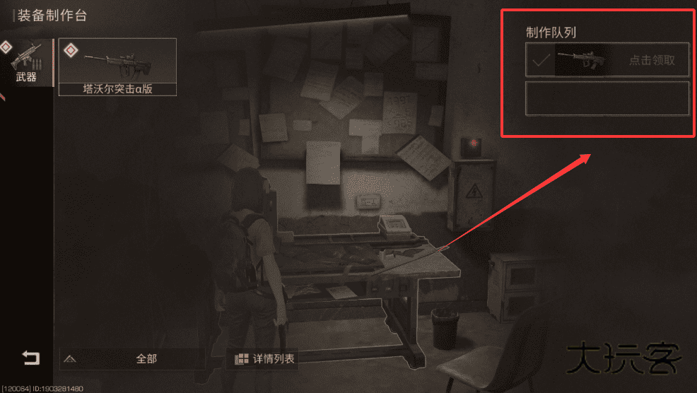 1、找装备制作台,在武器列表里选要造的,材料够就点制作,好了记得领哦。