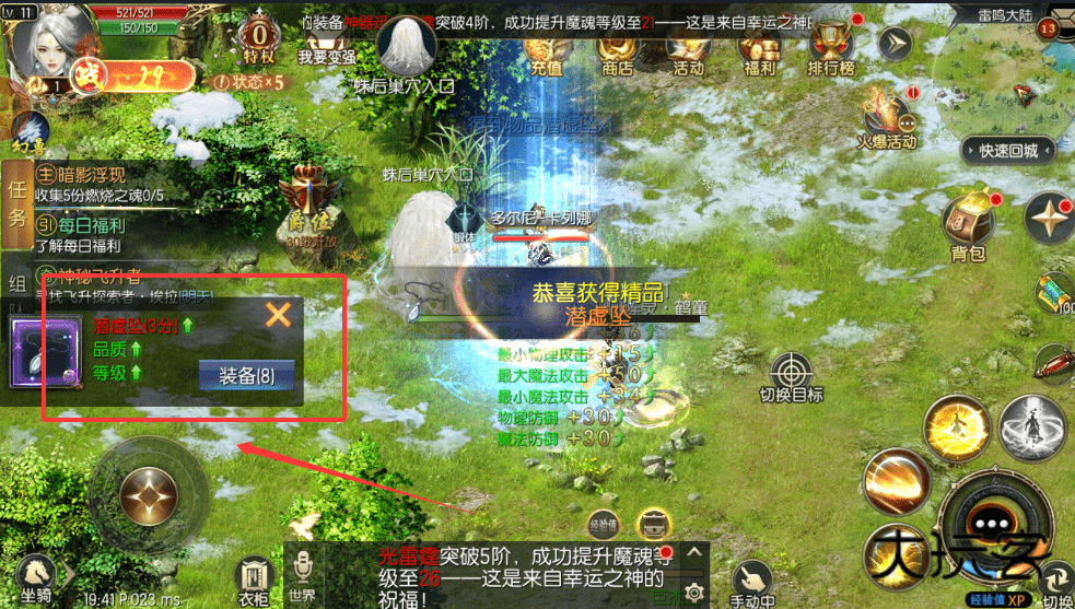 2、打怪掉落装备会弹窗显示属性,记得查看数值哦。像潜虚坠这种精品,直接对比身上装备替换就好。