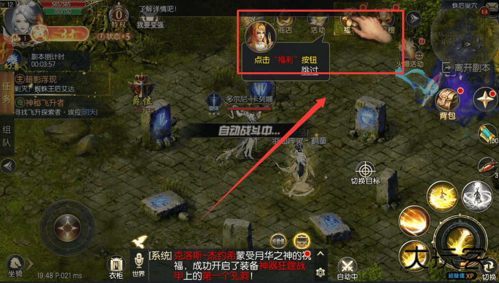 4、想省时间可以点右上角福利按钮,能跳过流程。副本里还能开自动战斗,方便你做其他操作嘛。