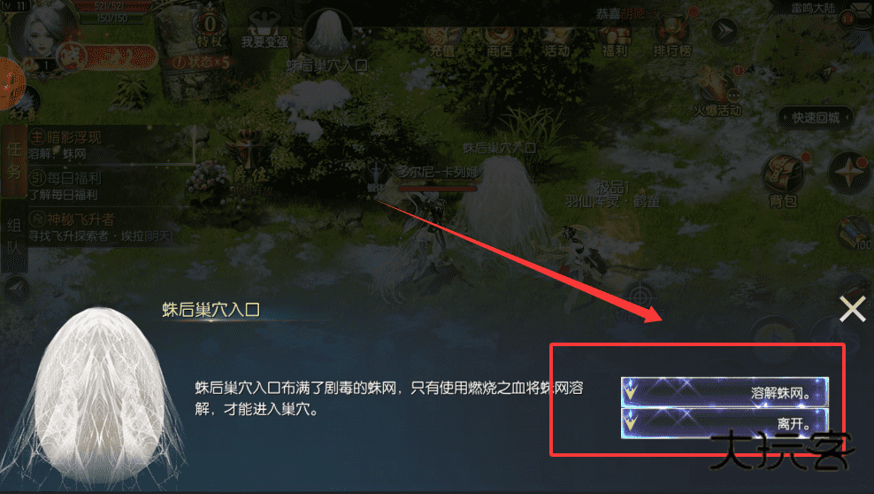 3、做探索任务时,遇到蛛网这类障碍,按提示用对应道具比如燃烧之血去溶解,就能进入新场景了。
