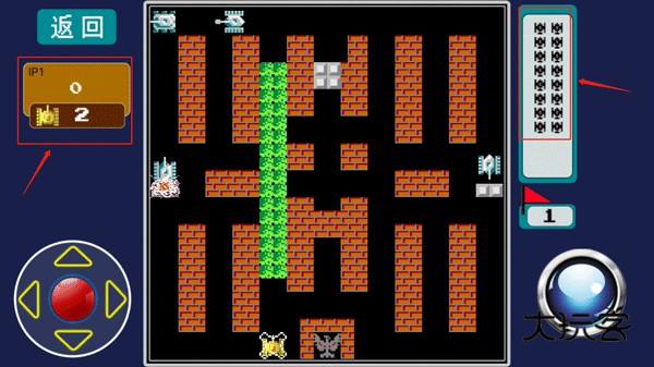 3、战场上分布着许多敌方坦克,你的任务是在保护自家老鹰基地的同时消灭它们。双方坦克的重生次数都有限制,界面左右两侧会实时显示剩余数量。