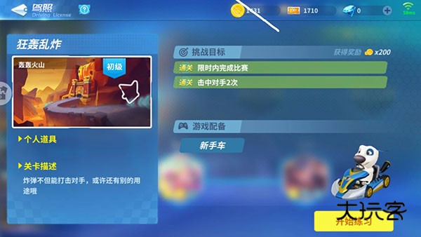 以初级驾照为例,玩家需要进行火箭起步、瞄准射击、转弯漂移、铜墙铁壁与狂轰乱炸五个小比赛,每个比赛都有该比赛需要完成的挑战目标,但共同的要求就是必须按时完成比赛,每个关卡的难度均不同,有些关卡不仅挑战目标十分有难度,而且关卡路线十分崎岖,让玩家难以完成比赛。玩家通过最后一关狂轰乱炸之后便能一个蓝色的驾照徽章以及改装点了,驾照徽章便是驾照的象征。
