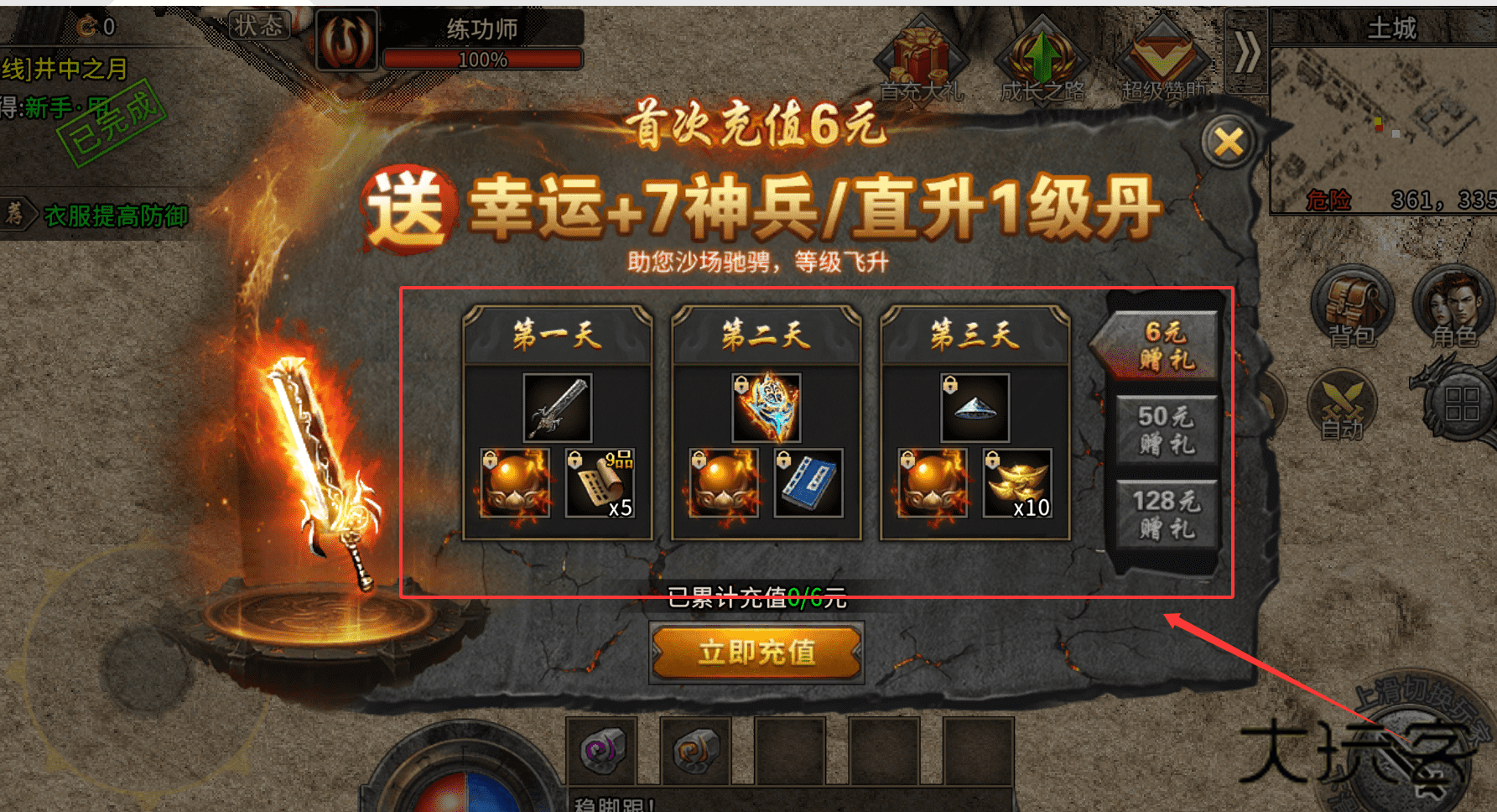 1、首充助力快速起步,你可以先完成6元首充,领取幸运+7神兵和直升丹,这样能直接提升战力。