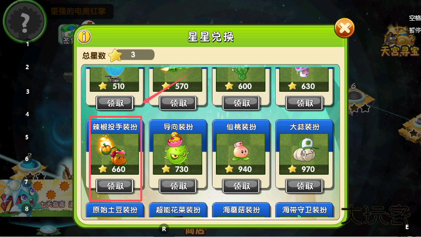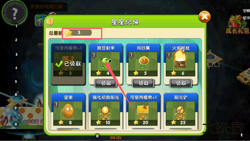 2、在星星兑换页面,查看总星数与各道具的星星消耗,比如“强化初始阳光”需要10颗星星,星数满足时点击道具下方的“领取”按钮,即可获得对应的功能道具。