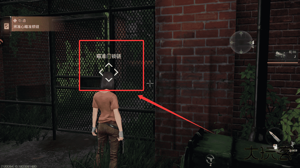 2、找到铁丝网大门,用准心瞄准门上的锁链,根据屏幕提示操作就可以啦。