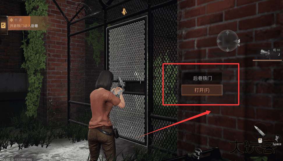 2、遇到后巷铁门,将角色对准它,看到打开提示后按下指定按键就能进入啦。