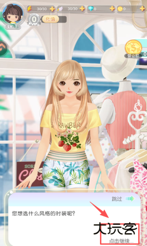1、看到界面弹出 “您想选什么风格的时装呢?” 的提示后,点击弹窗里的 “点击继续” 按钮,就能推进流程。