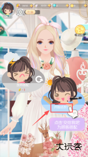 2、当界面出现 “点击‘交给我吧’为顾客搭配” 的提示后,点击 “开始试衣!” 按钮,即可进入搭配环节。
