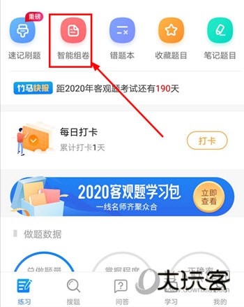1、打开竹马法考APP,进入到“练习”功能界面,选择“智能组卷”功能按钮,点击进入即可。