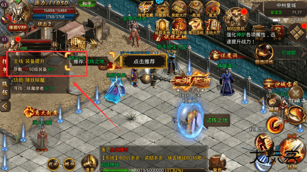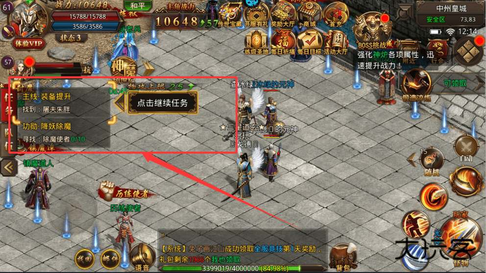 3、装备提升是前期重要目标,根据任务要求穿戴指定等级装备,并利用强化神炉等功能来快速提高战力。