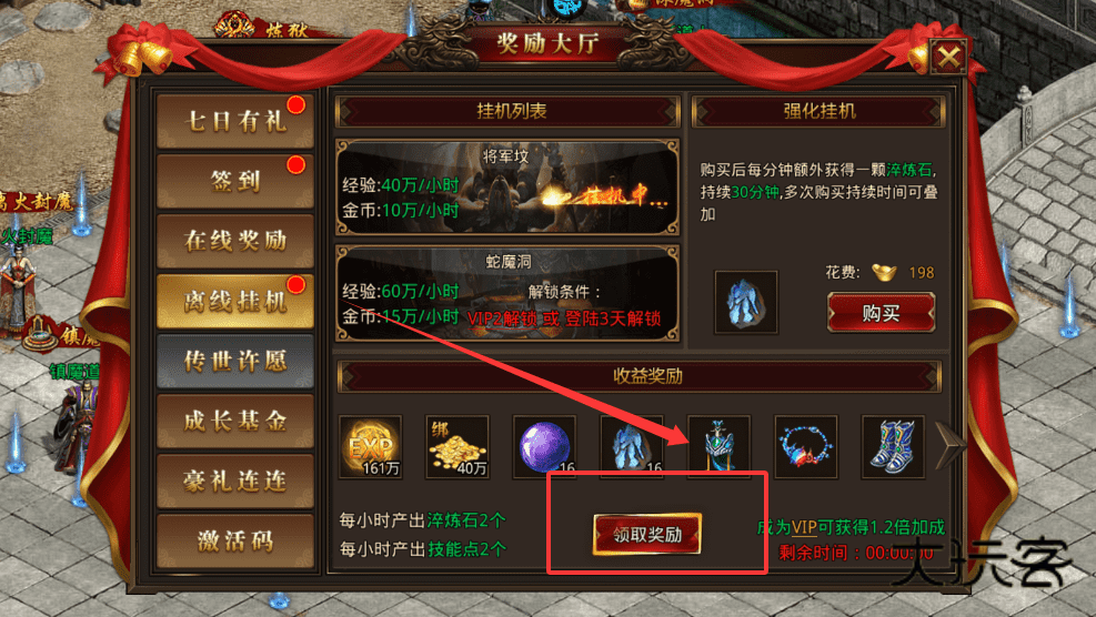 1、在奖励大厅可查看挂机收益并领取奖励,记得每日签到和完成七日有礼,能获取大量经验与金币。