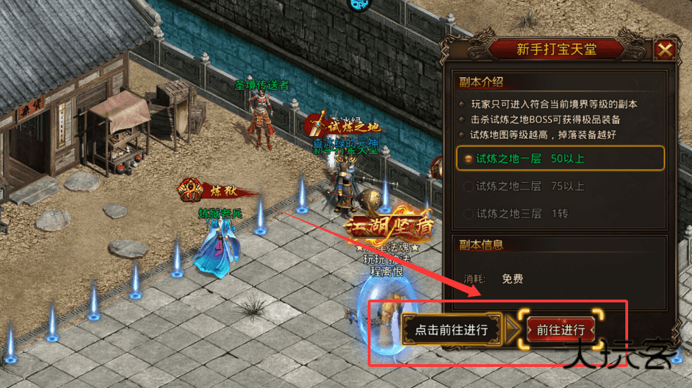 4、前往试炼之地打宝时,先确认自身等级符合副本要求,之后点击“前往进行”即可传送进入副本获取装备。