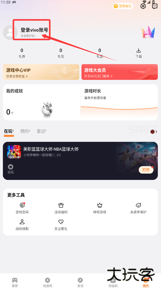 1、登录个人vivo账号后,可进入“我的”页面查看各类游戏权益与成就记录,其中包含VIP状态、优惠券领取及游玩历史等内容,便于集中管理个人游戏资产与进度。