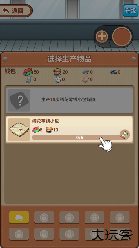 4、根据任务提示,在生产线菜单中点击“绣花零钱小包”选项,开始生产该商品并积累资金。