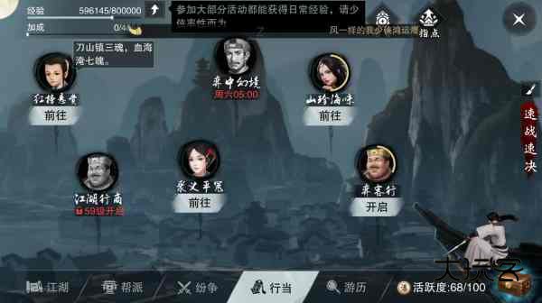 37级去完成2次当日开放的组队行当日常(聚义平冤/弈中幻境/江湖行商/山珍海味/白榜悬赏),完美40级。这里还是刚好,副本(江湖纪事)40级开启,再刷两次新秀副本-十二连环坞,就到42了。