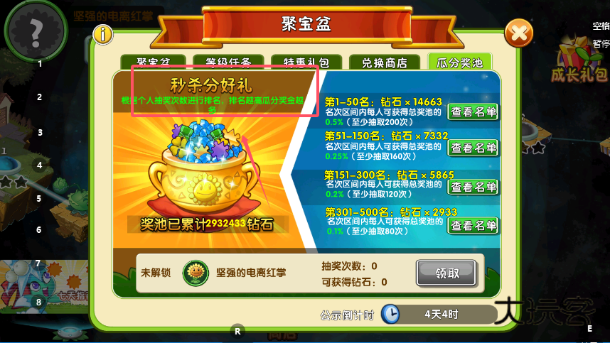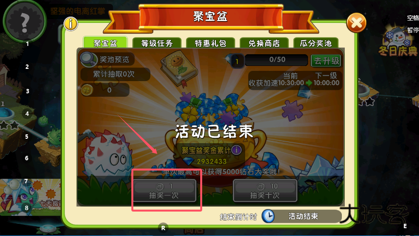1、在植物大战僵尸2的游戏世界里,定位并进入“天宫寻宝”活动页面,页面布局分明,上方是“天宫寻宝”、“累计抽取”等选项卡,下方核心区域则是抽取记录与相关规则的具体说明。