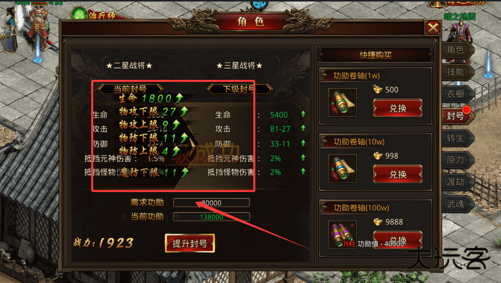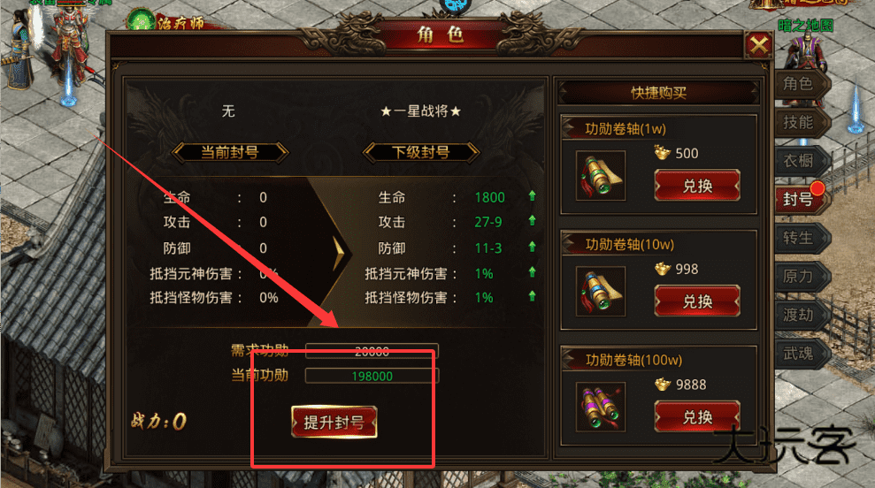 3、如果功勋不足,可以在右侧快捷购买栏兑换功勋卷轴来补充。