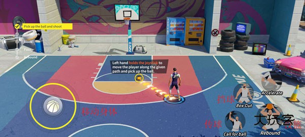1、打开全明星街球派对,比赛界面内左下角可以移动角色,右下角有传球和投篮等动作。