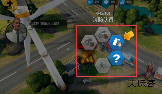 4、根据现场情况选用对应道具,若发生火灾则点击灭火器进行扑救。正确使用道具是解决事件的关键步骤。