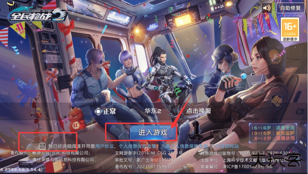 1、启动后首先核对适龄提示,确认16岁以上方可进入。选择华东2区或其他可用服务器,并仔细阅读用户协议、个人信息保护政策及儿童信息保护指引,了解著作权人畅游云资(北京)科技有限公司及相关审批备案信息。
