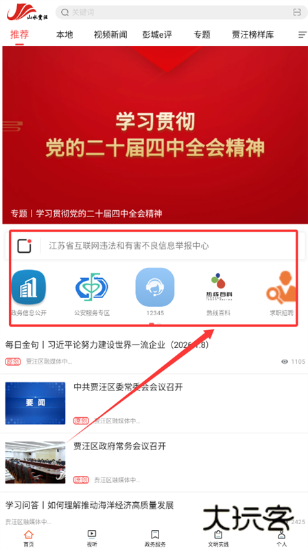 1、在主界面顶部找到功能分类,点击政务或举报中心入口就能进行举报操作了。