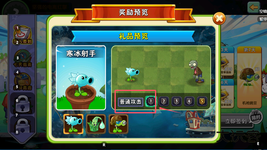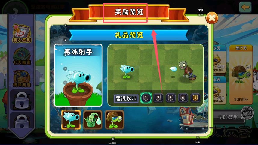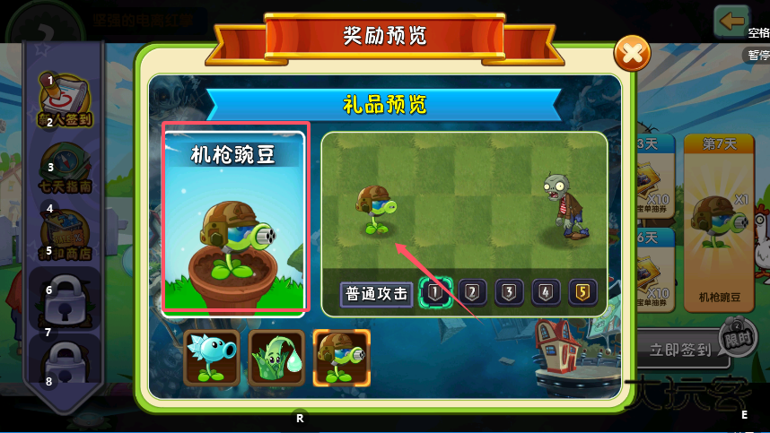 4、查看完奖励内容后,只需点击对应日期的“立即签到”按钮,即可完成当日签到并领取奖励。坚持签到满7天后,便能解锁“机豌豆”等特殊植物,为后续的游戏进程提供帮助。